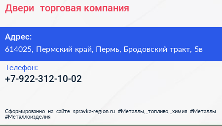 Двери+, торговая компания по адресу 614025, Пермский край, Пермь, Бродовский тракт, 5в в дальнейшем Организация, размещена в следующих категориях: