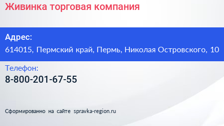 Живинка, торговая компания по адресу 614015, Пермский край, Пермь, Николая Островского, 10 в дальнейшем Организация, размещена в следующих категориях: