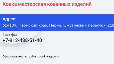 Ковка, мастерская кованных изделий по адресу 614109, Пермский край, Пермь, Омутинский переулок, 218 в дальнейшем Организация, размещена в следующих категориях: