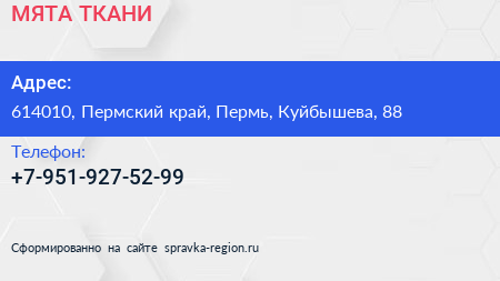 МЯТА ТКАНИ по адресу 614010, Пермский край, Пермь, Куйбышева, 88 в дальнейшем Организация, размещена в следующих категориях: