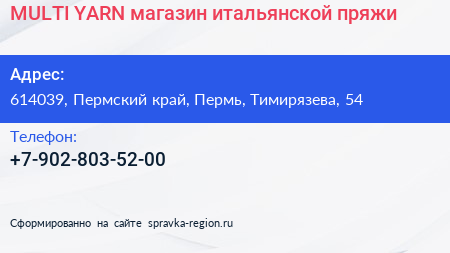 MULTI YARN, магазин итальянской пряжи по адресу 614039, Пермский край, Пермь, Тимирязева, 54 в дальнейшем Организация, размещена в следующих категориях: