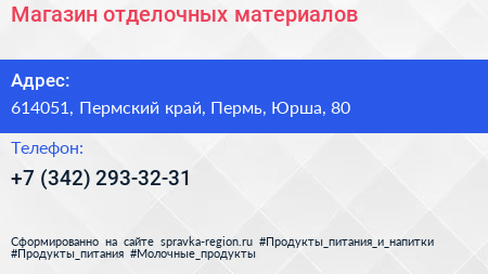 Магазин отделочных материалов по адресу 614051, Пермский край, Пермь, Юрша, 80 в дальнейшем Организация, размещена в следующих категориях: