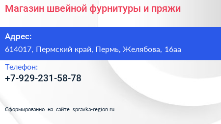 Магазин швейной фурнитуры и пряжи по адресу 614017, Пермский край, Пермь, Желябова, 16аа в дальнейшем Организация, размещена в следующих категориях: