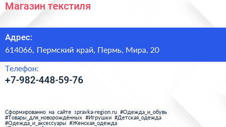 Магазин текстиля по адресу 614066, Пермский край, Пермь, Мира, 20 в дальнейшем Организация, размещена в следующих категориях:
