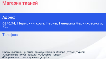 Магазин тканей по адресу 614104, Пермский край, Пермь, Генерала Черняховского, 72а в дальнейшем Организация, размещена в следующих категориях: