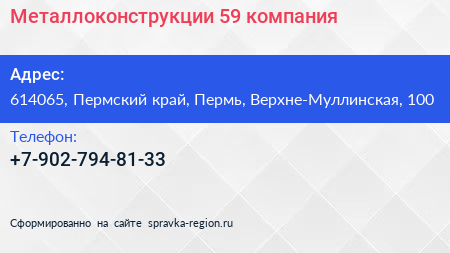 Металлоконструкции 59, компания по адресу 614065, Пермский край, Пермь, Верхне-Муллинская, 100 в дальнейшем Организация, размещена в следующих категориях: