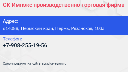 СК Импэкс, производственно-торговая фирма по адресу 614088, Пермский край, Пермь, Рязанская, 103а в дальнейшем Организация, размещена в следующих категориях: