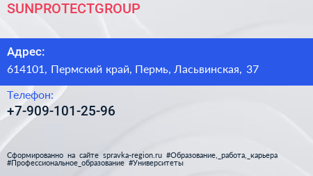 SUNPROTECTGROUP по адресу 614101, Пермский край, Пермь, Ласьвинская, 37 в дальнейшем Организация, размещена в следующих категориях: