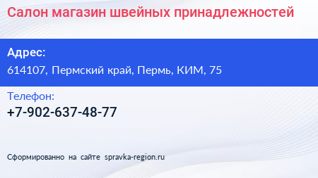 Салон-магазин швейных принадлежностей по адресу 614107, Пермский край, Пермь, КИМ, 75 в дальнейшем Организация, размещена в следующих категориях: