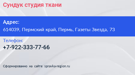 Сундук, студия ткани по адресу 614039, Пермский край, Пермь, Газеты Звезда, 73 в дальнейшем Организация, размещена в следующих категориях: