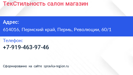 ТекСтильность, салон-магазин по адресу 614016, Пермский край, Пермь, Революции, 60/1 в дальнейшем Организация, размещена в следующих категориях: