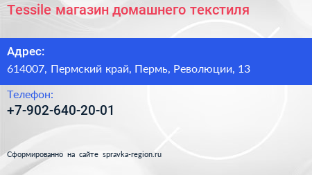 Tessile, магазин домашнего текстиля по адресу 614007, Пермский край, Пермь, Революции, 13 в дальнейшем Организация, размещена в следующих категориях:
