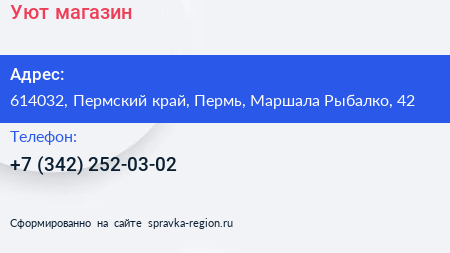 Уют, магазин по адресу 614032, Пермский край, Пермь, Маршала Рыбалко, 42 в дальнейшем Организация, размещена в следующих категориях: