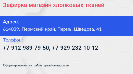 Зефирка, магазин хлопковых тканей по адресу 614039, Пермский край, Пермь, Швецова, 41 в дальнейшем Организация, размещена в следующих категориях: