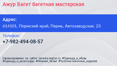 Ажур-Багет, багетная мастерская по адресу 614101, Пермский край, Пермь, Автозаводская, 23 в дальнейшем Организация, размещена в следующих категориях: