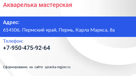 Акварелька, мастерская по адресу 614506, Пермский край, Пермь, Карла Маркса, 8а в дальнейшем Организация, размещена в следующих категориях: