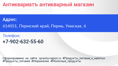 Антиквариатъ, антикварный магазин по адресу 614051, Пермский край, Пермь, Уинская, 6 в дальнейшем Организация, размещена в следующих категориях: