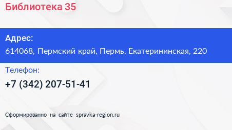 Библиотека №35 по адресу 614068, Пермский край, Пермь, Екатерининская, 220 в дальнейшем Организация, размещена в следующих категориях:
