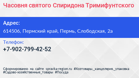 Часовня святого Спиридона Тримифунтского по адресу 614506, Пермский край, Пермь, Слободская, 2а в дальнейшем Организация, размещена в следующих категориях: