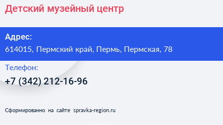 Детский музейный центр по адресу 614015, Пермский край, Пермь, Пермская, 78 в дальнейшем Организация, размещена в следующих категориях: