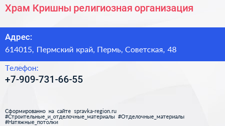 Храм Кришны, религиозная организация по адресу 614015, Пермский край, Пермь, Советская, 48 в дальнейшем Организация, размещена в следующих категориях: