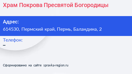 Храм Покрова Пресвятой Богородицы по адресу 614530, Пермский край, Пермь, Баландина, 2 в дальнейшем Организация, размещена в следующих категориях: