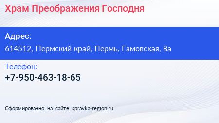 Храм Преображения Господня по адресу 614512, Пермский край, Пермь, Гамовская, 8а в дальнейшем Организация, размещена в следующих категориях: