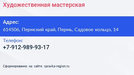 Художественная мастерская по адресу 614506, Пермский край, Пермь, Садовое кольцо, 14 в дальнейшем Организация, размещена в следующих категориях: