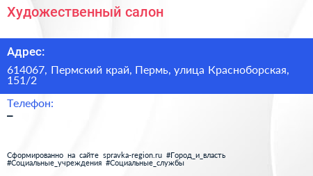 Художественный салон по адресу 614067, Пермский край, Пермь, улица Красноборская, 151/2 в дальнейшем Организация, размещена в следующих категориях: