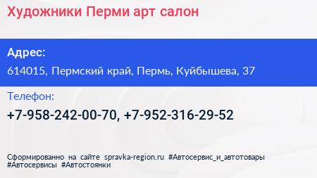 Художники Перми, арт-салон по адресу 614015, Пермский край, Пермь, Куйбышева, 37 в дальнейшем Организация, размещена в следующих категориях: