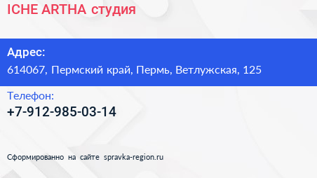 ICHE ARTHA, студия по адресу 614067, Пермский край, Пермь, Ветлужская, 125 в дальнейшем Организация, размещена в следующих категориях: