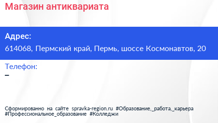 Магазин антиквариата по адресу 614068, Пермский край, Пермь, шоссе Космонавтов, 20 в дальнейшем Организация, размещена в следующих категориях: