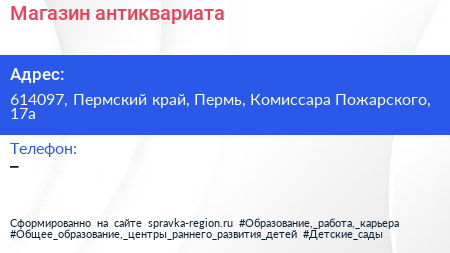 Магазин антиквариата по адресу 614097, Пермский край, Пермь, Комиссара Пожарского, 17а в дальнейшем Организация, размещена в следующих категориях:
