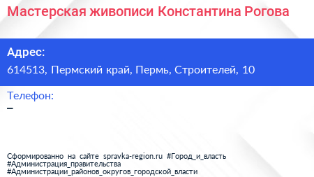 Мастерская живописи Константина Рогова по адресу 614513, Пермский край, Пермь, Строителей, 10 в дальнейшем Организация, размещена в следующих категориях: