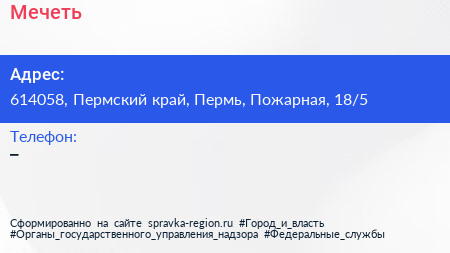 Мечеть по адресу 614058, Пермский край, Пермь, Пожарная, 18/5 в дальнейшем Организация, размещена в следующих категориях: