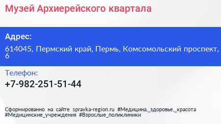 Музей Архиерейского квартала по адресу 614045, Пермский край, Пермь, Комсомольский проспект, 6 в дальнейшем Организация, размещена в следующих категориях: