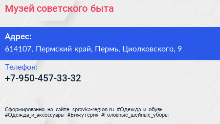 Музей советского быта по адресу 614107, Пермский край, Пермь, Циолковского, 9 в дальнейшем Организация, размещена в следующих категориях: