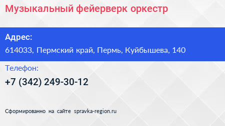 Музыкальный фейерверк, оркестр по адресу 614033, Пермский край, Пермь, Куйбышева, 140 в дальнейшем Организация, размещена в следующих категориях: