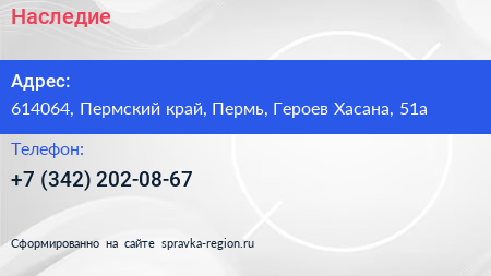 Наследие по адресу 614064, Пермский край, Пермь, Героев Хасана, 51а в дальнейшем Организация, размещена в следующих категориях: