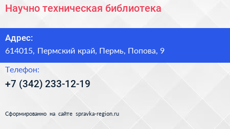 Научно-техническая библиотека по адресу 614015, Пермский край, Пермь, Попова, 9 в дальнейшем Организация, размещена в следующих категориях: