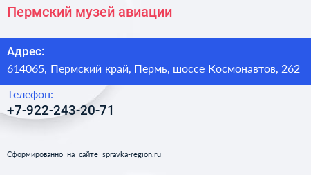 Пермский музей авиации по адресу 614065, Пермский край, Пермь, шоссе Космонавтов, 262 в дальнейшем Организация, размещена в следующих категориях: