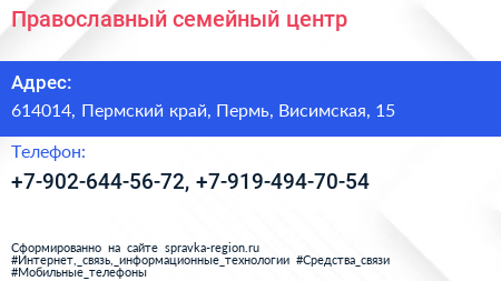 Православный семейный центр по адресу 614014, Пермский край, Пермь, Висимская, 15 в дальнейшем Организация, размещена в следующих категориях: