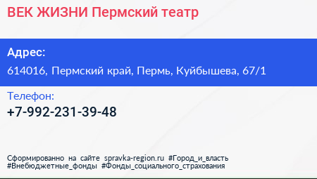 ВЕК ЖИЗНИ, Пермский театр по адресу 614016, Пермский край, Пермь, Куйбышева, 67/1 в дальнейшем Организация, размещена в следующих категориях: