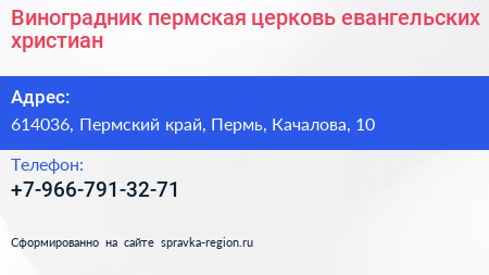 Виноградник, пермская церковь евангельских христиан по адресу 614036, Пермский край, Пермь, Качалова, 10 в дальнейшем Организация, размещена в следующих категориях:
