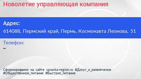 Новолетие, управляющая компания по адресу 614088, Пермский край, Пермь, Космонавта Леонова, 51 в дальнейшем Организация, размещена в следующих категориях: