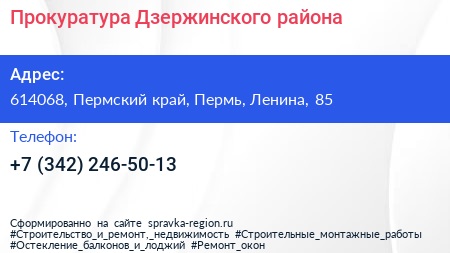 Прокуратура Дзержинского района по адресу 614068, Пермский край, Пермь, Ленина, 85 в дальнейшем Организация, размещена в следующих категориях: