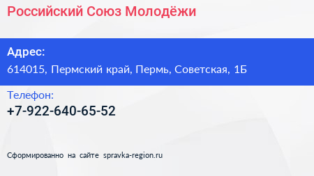 Российский Союз Молодёжи по адресу 614015, Пермский край, Пермь, Советская, 1Б в дальнейшем Организация, размещена в следующих категориях:
