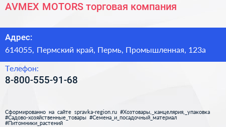 AVMEX-MOTORS, торговая компания по адресу 614055, Пермский край, Пермь, Промышленная, 123а в дальнейшем Организация, размещена в следующих категориях:
