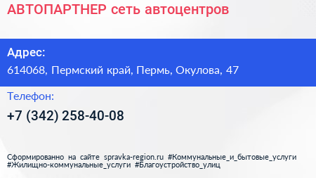 АВТОПАРТНЕР, сеть автоцентров по адресу 614068, Пермский край, Пермь, Окулова, 47 в дальнейшем Организация, размещена в следующих категориях: