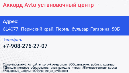 Аккорд Avto, установочный центр по адресу 614077, Пермский край, Пермь, бульвар Гагарина, 50Б в дальнейшем Организация, размещена в следующих категориях: